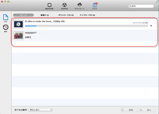 動画を設定後、「変換」ボタンをクリックすると、変換し始めます。「タスク」の変換中に変換の進度も見つかります。
