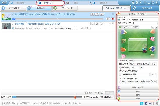 動画をDVDに書き込む前に、左パネルには「DVDコンフィグシス」と「書き込み設定」というオプションが用意されます。これを経由でDVDメニュー、背景音楽/画像、持続時間、書き込み速度、動画サイズなどを楽して設定できます。