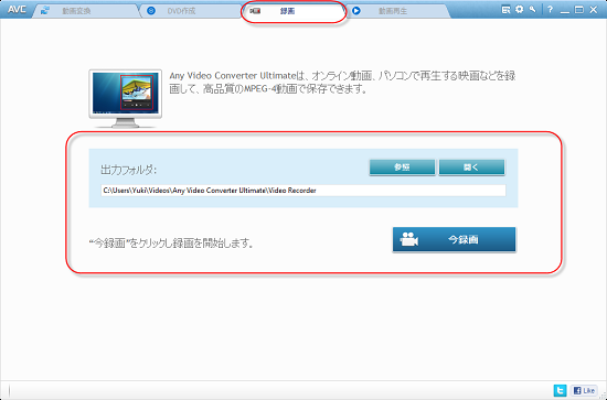 ● 出力先:録画インターフェスには、設定した出力先があります。デフォルトフォルダは C:\ユーザー\お名前\マイドキュメント\Any Video Converter Ultimate\Video Recorderです。若しくは、録画パネルには、”開く” をクリックすると録画した動画フォルダが表示されます。
