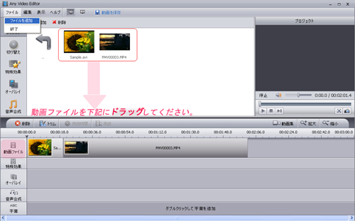 ♦ step②:追加した動画ファイルをドラッグして編集パネルに追加してください。(二つの動画を結合して編集したい場合は、同じ方法で二番目の動画ファイルを追加してください。)