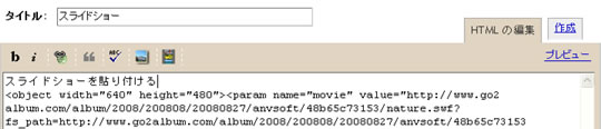 プレビューをクリックしてプレビューできます。あるいは投稿を公開ボタンをクリックして投稿を作成してください。保存したら、スライドショーあるいはYouTubeの貼り付けは完成です。ブログの幅に応じて、貼り付けたコードの widthとheight (幅と高さ)の値は自分で好きに調節できます。あるいはPhoto Flash Maker と Web FLV Player Pro で予めに出力したいスライドショーのサイズを設定してください。