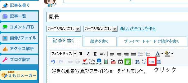 三、Livedoor blogを開いてログインしてください。「記事を書く」をクリックして、新しい記事を開いて、タイトルの入力、カテゴリの選択などを完成して、下図のように「Html」をクリックしてください。