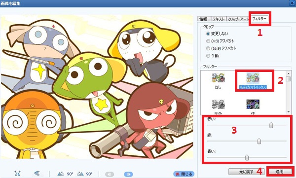 ♦ 画像をPhoto Flash Maker に追加後、ダブルクリックし、「画像を編集」というウィンドウが開きます;下図のように、「フィルター」タブをクリックし、フィルター効果を選び、効果の色、明るさなどを調整して、最後「適用」ボタンをクリックしてください。
