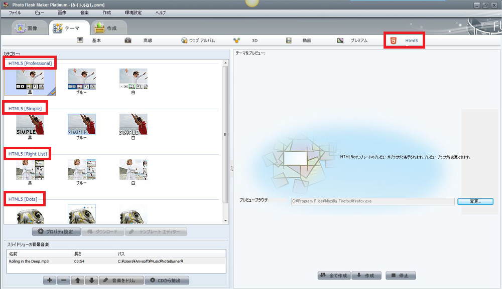 Photo Flash MakerでHTML5スライドショーを作成は簡単でDreamweaverなんか必要がありません。専門のコード編集知識がいらない、ただ写真、バックグラウンド音楽を追加して、「HTML5」のテーマを選択して作成できます!