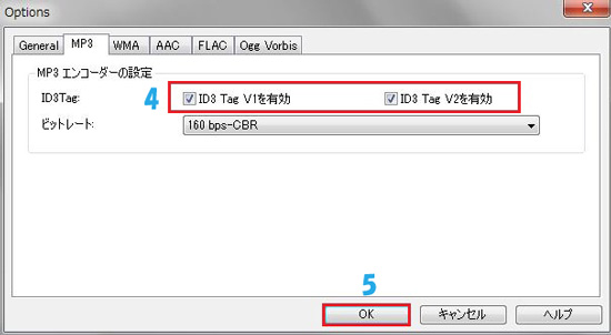 ③ また、「MP3」タブをクリックし、ID タグをチェックして「OK」ボタンをクリックしてください。